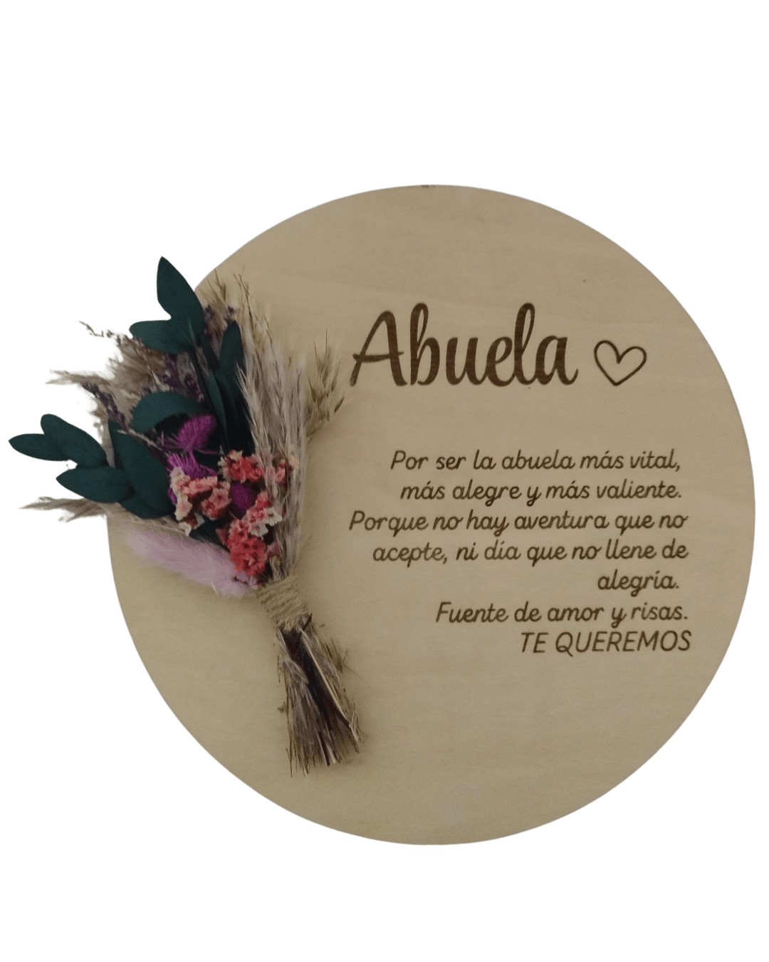 Placa dedicatoria grabada con texto personalizado y decorada con flores preservadas.